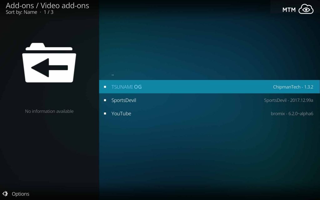Now that its home repo is installed, the Tsunami OG addon is just waiting to be installed from within. Note that Tsunami OG also installs the SportsDevil and YouTube Kodi addons which are used by Tsunami OG for some of its stream access.